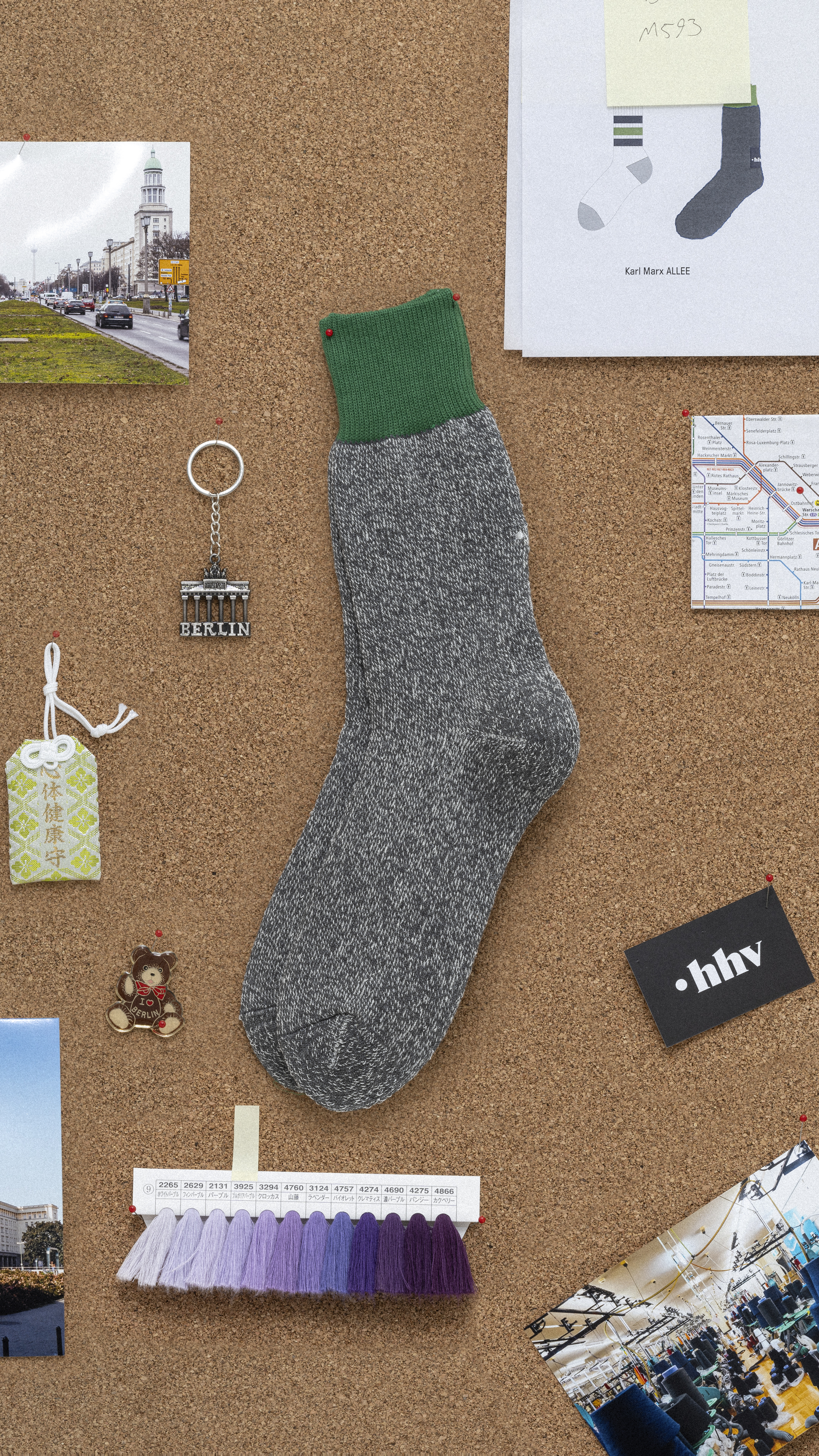 Da wir in Friedrichshain ansässig sind, gibt es zwei Hauptverkehrsadern… wenn du uns im Laden besucht hast, bist du realistischerweise am Bahnhof Warschauer Straße ausgestiegen oder hast dein Auto entlang der Karl-Marx-Allee gefahren. Beide dieser ikonischen Berliner Orte sind in den HHV x Rototo-Socken dargestellt.