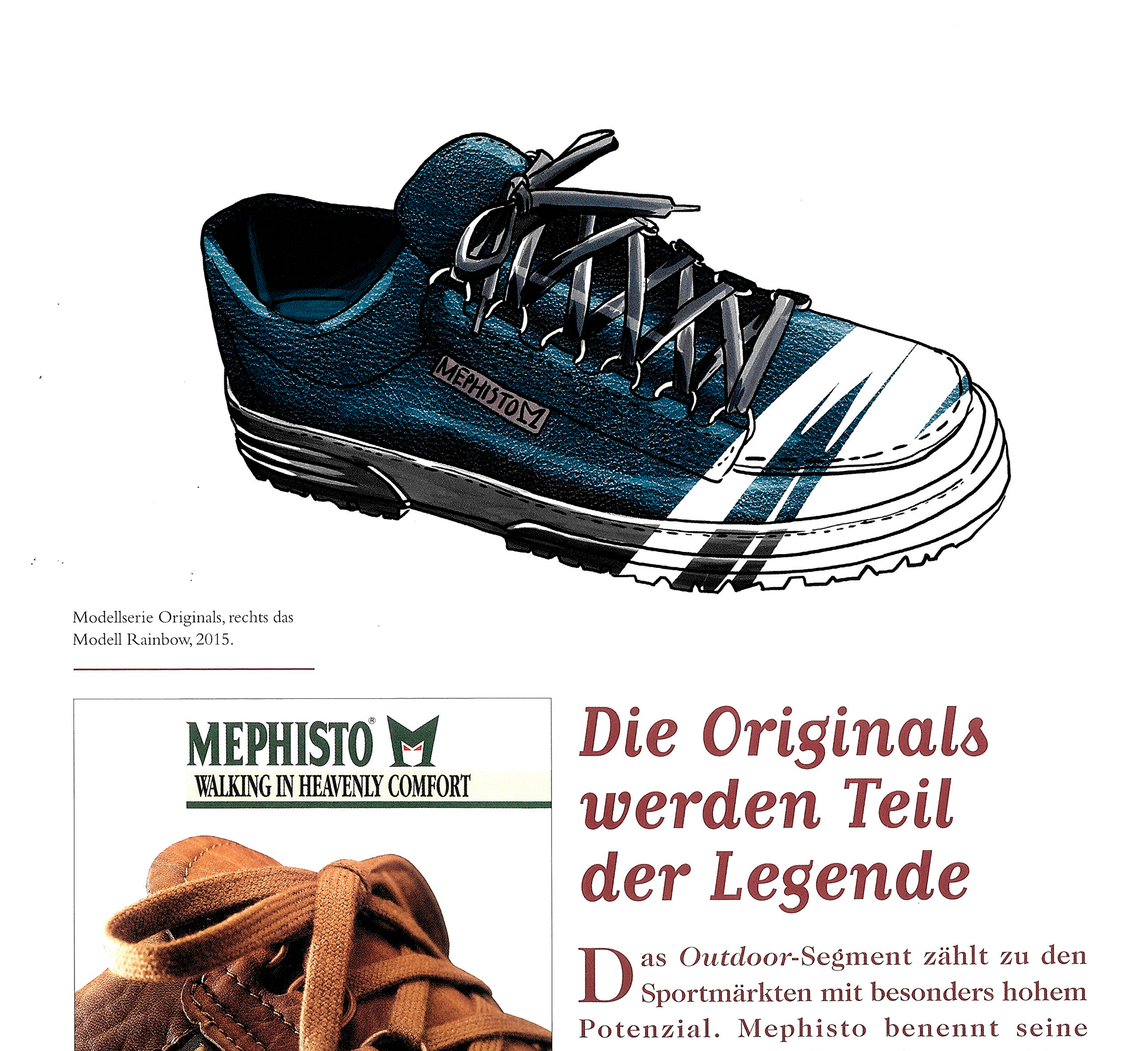 Die Geschichte Mephistos ist sehr straight. Ein vorbildliches Unternehmen, das aus Schuhen in allerbester Qualität ein weltweites Business gemacht hat. Dessen Schuhe von Janet Jackson, Steven Spielberg und Arnold Schwarzenegger getragen werden. Ich habe gehört, dass Arnold immer persönlich per Telefon ordert. Pavarotti hat das Modell Match getragen.